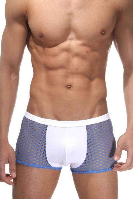 Трусы-боксеры из крупной эластичной сетки синего цвета. Боксеры на широкой белой резинке, имеют спереди гладкую плотную вставку.